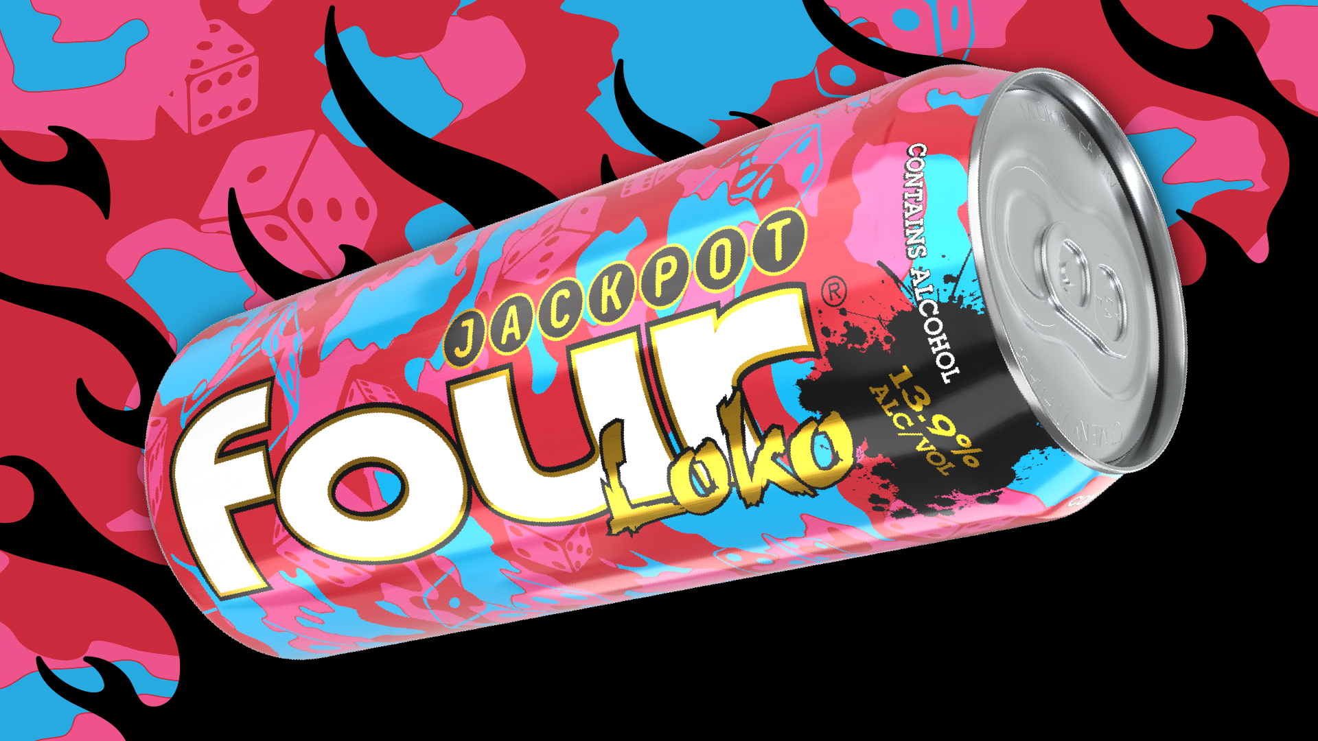 A full flavor-launch design system for Four Loko Jackpot, including packaging, promotional visuals, campaign support materials, and branded merchandise.
