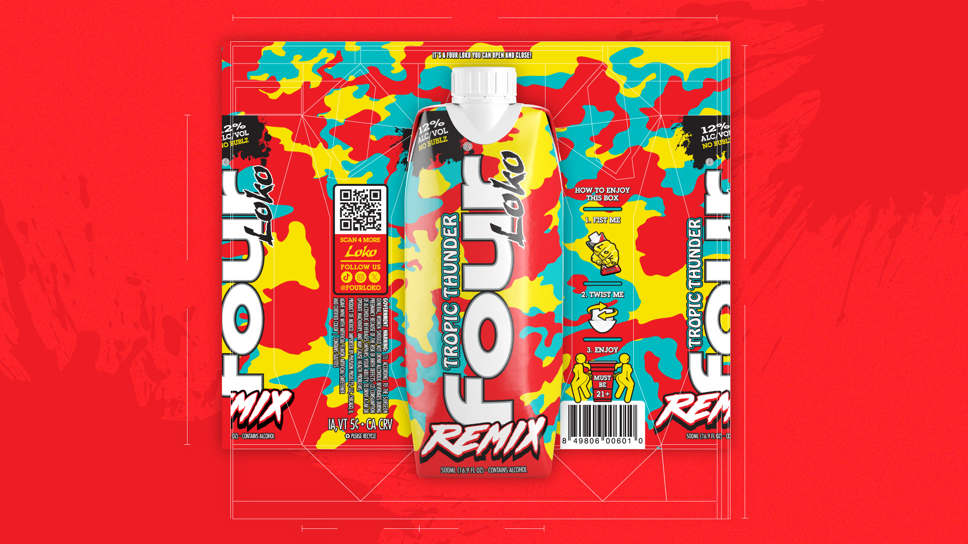 Four Loko Remix marked the evolution of the brand’s visual identity as the product transitioned from cans to a tetra pack format, creating the opportunity to introduce a new custom “Remix” type treatment. The design focused on building a typographic system that felt bold and energetic while working within the unique proportions and panel structure of the tetra. By developing the Remix typography specifically for this format, the packaging established a clear visual identity across production art and shelf presentation, strengthening brand recognition and supporting Four Loko’s expansion into new, convenience-focused packaging.